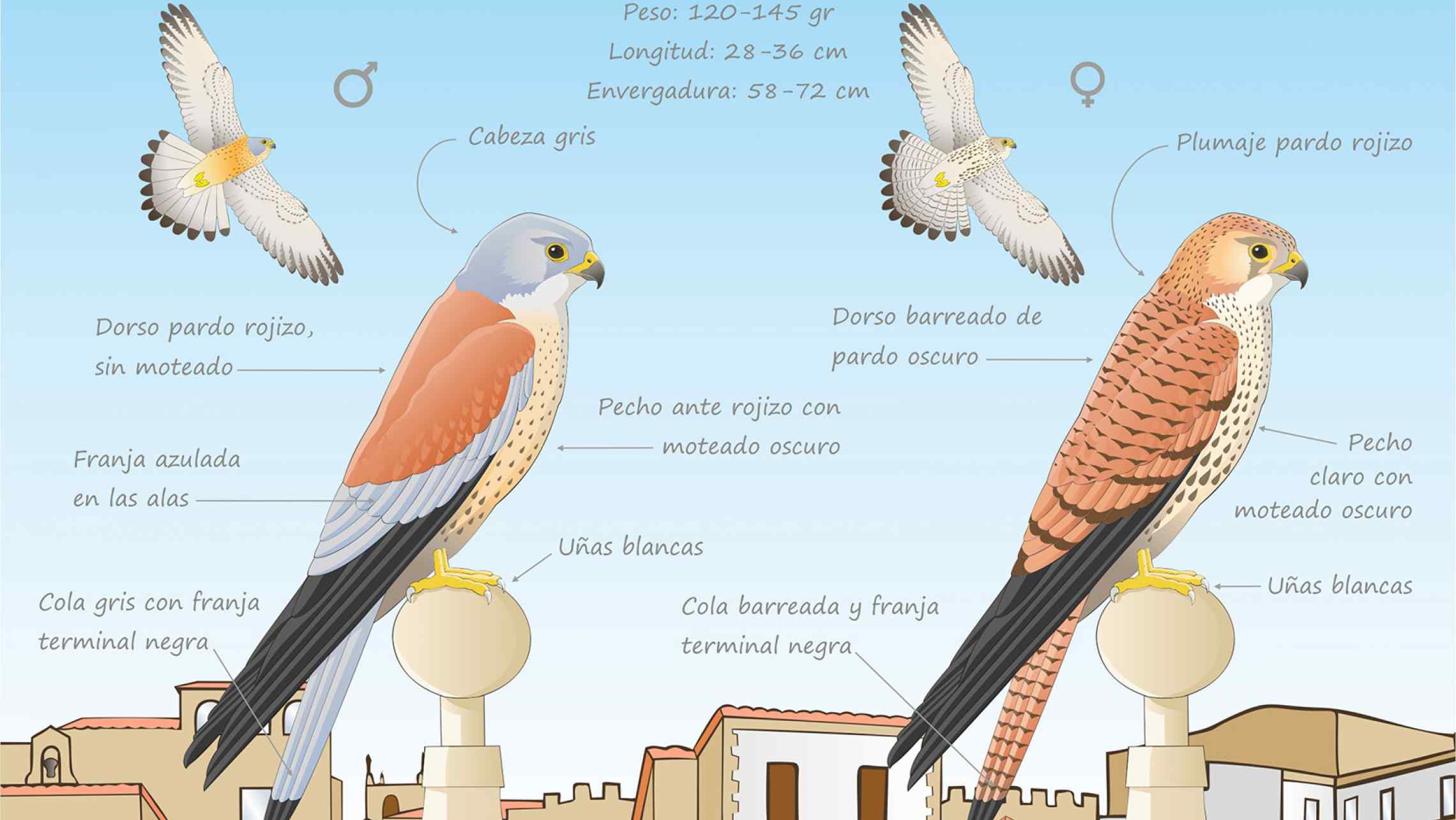 Se trata de la rapaz diurna de menor tamaño nidificante en la península ibérica; el macho y la hembra presentan un plumaje muy diferente, como se puede observar en el gráfico, mientras que los ejemplares jóvenes son muy similares a las hembras.