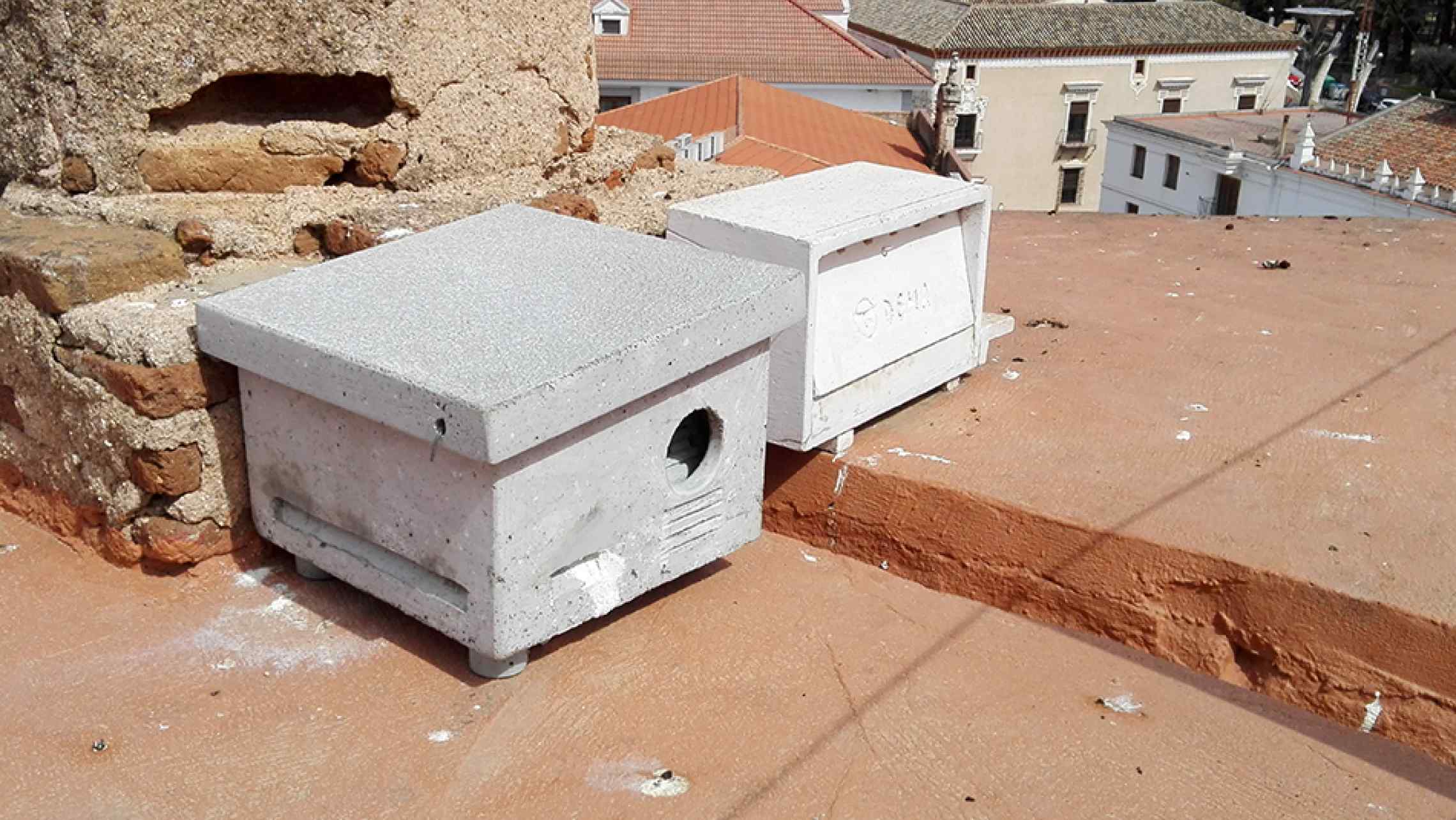 Se instalan los nuevos nidales de mortero-corcho para testeo en la iglesia de la Purificación (Almendralejo)
